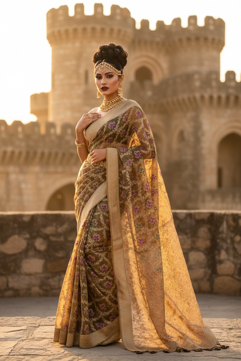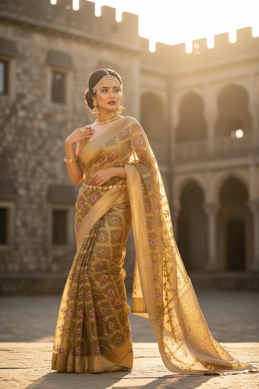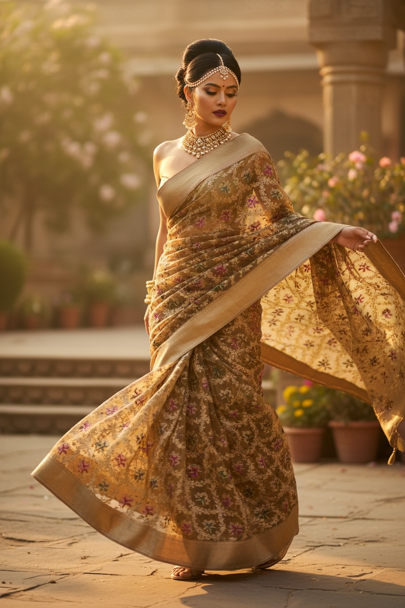 Royalty in You — a pure muslin silk saree enriched with soft golden hues and intricate floral motif embroidery, delicately finished with Meena kari work. Every detail reflects craftsmanship, grace, and timeless elegance, making it perfect for any occasion.