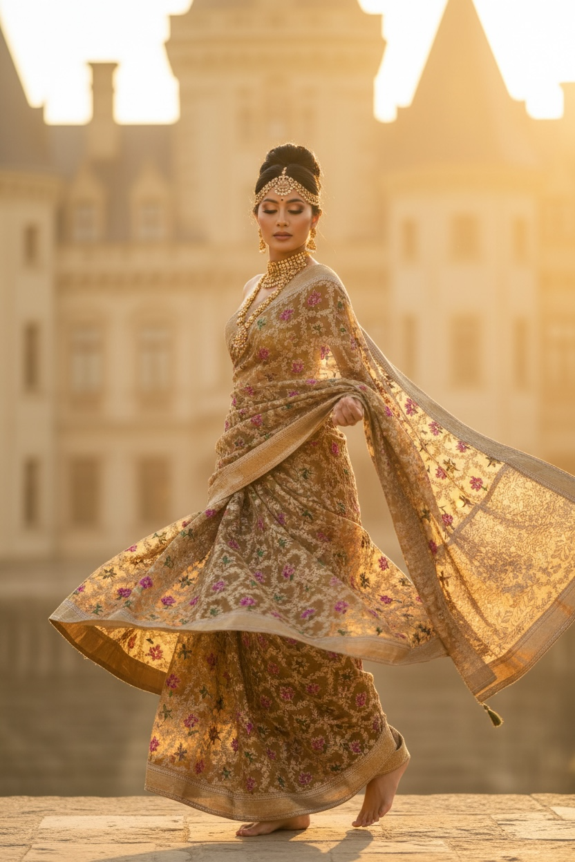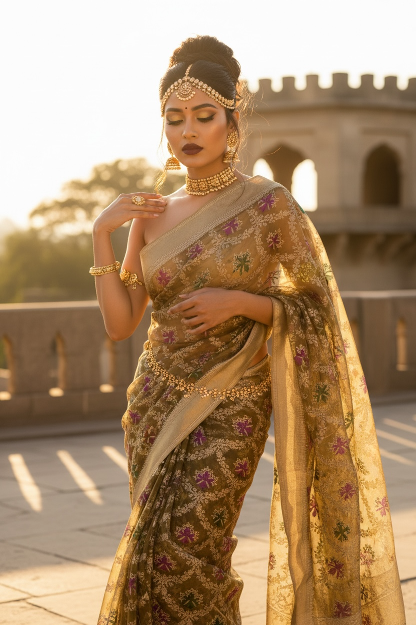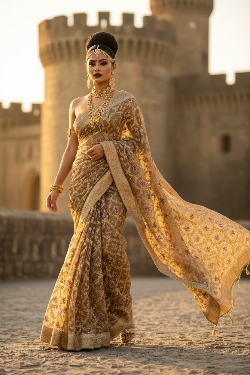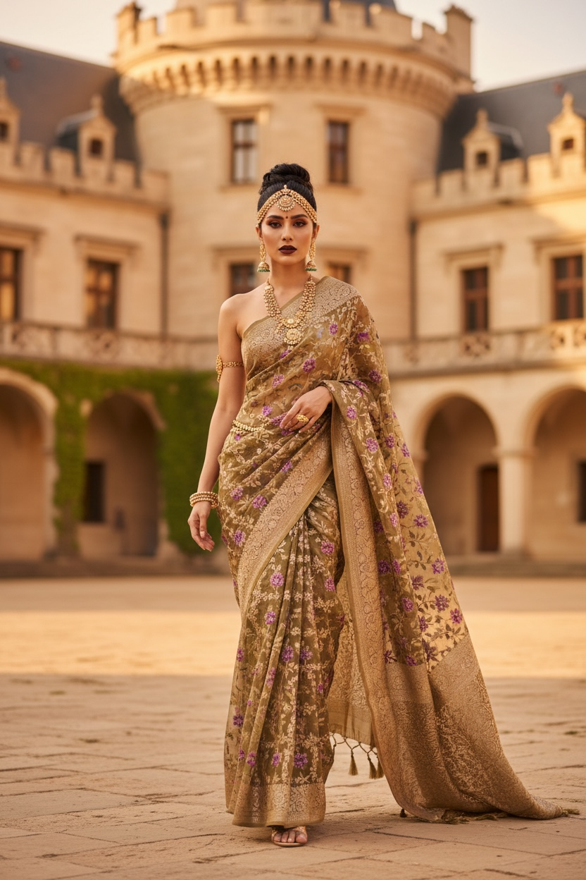 Royalty in You — a pure muslin silk saree enriched with soft golden hues and intricate floral motif embroidery, delicately finished with Meena kari work. Every detail reflects craftsmanship, grace, and timeless elegance, making it perfect for any occasion.