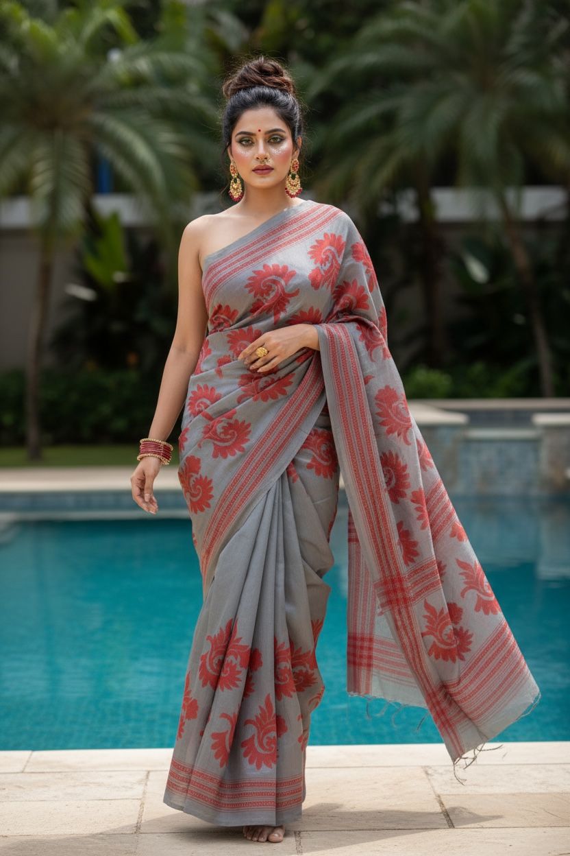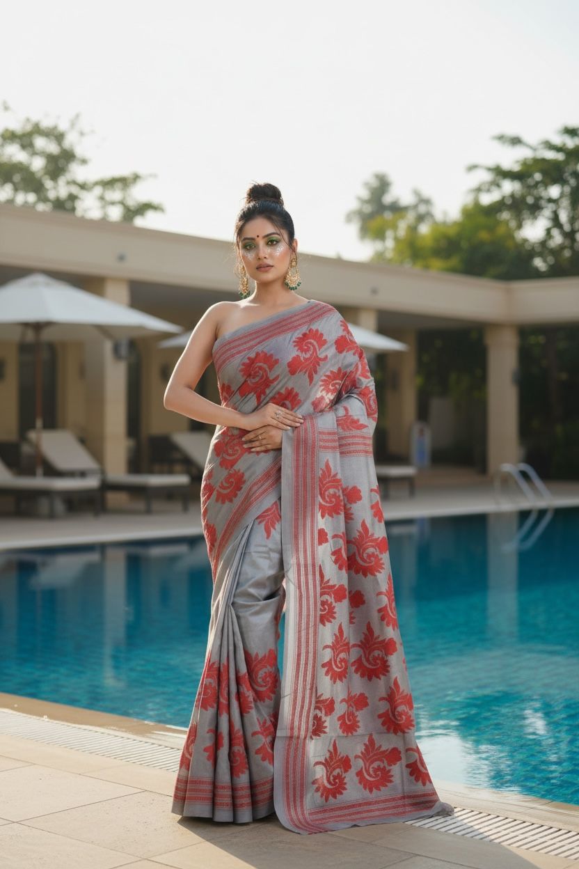 Silver Mist, Crimson Bloom (Pure Silk Saree)
