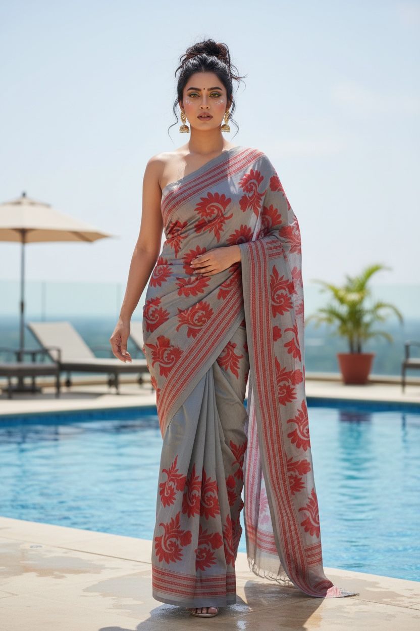 Step into understated luxury with this Pure Silk saree in a soft gray base, highlighted by striking red thread motifs in a refined half-paisley inspired design. The vivid red detailing creates a beautiful contrast against the calm gray — symbolizing the brightness of life rising through serenity.